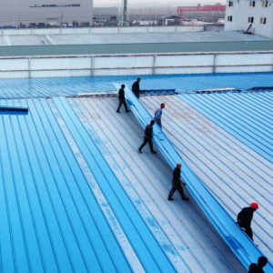 and now we are laying our new steel roof tile, our steel roof tile is corrosion resistant, does not rust, not fade, it can reduce a lot of follow-up trouble.